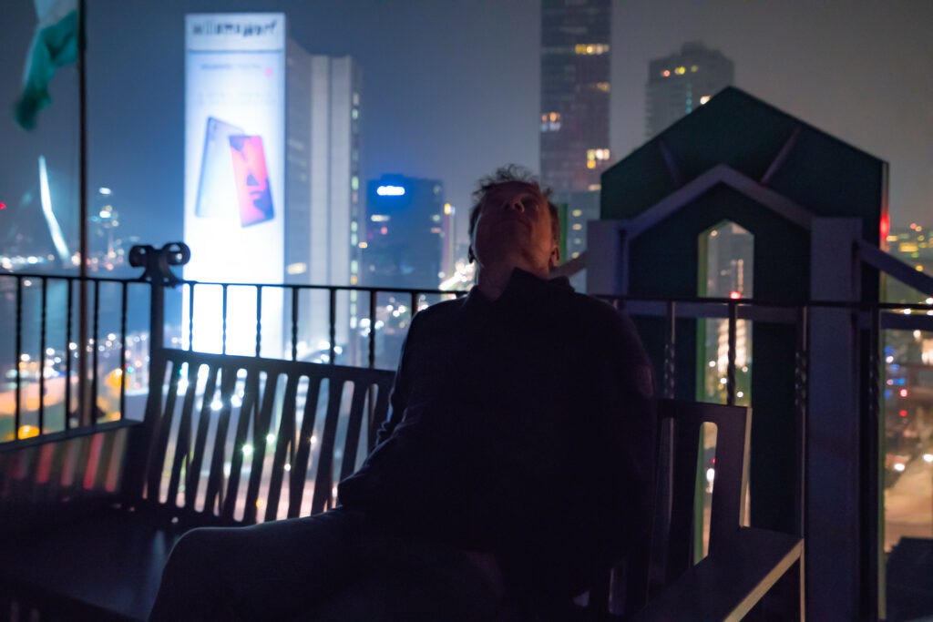 Voor ons en voor Marjolijn was het artikel gelukkig wel het begin van iets nieuws. Het bleek het startschot te zijn voor de Academie van Stadsastronauten, een project waarin we onderzochten hoe we aardebewoners kunnen laten nadenken als ruimtevaarders. We onderzochten hoe we het overzichtseffect de transcendentale ervaring die ruimtevaarders doet beseffen dat ze goed voor elkaar en voor de planeet moeten zorgen, konden opwekken in de dichtgeslibde stedelingen die we zijn. Met de Academie van Stadsastronauten maakten we in 02018 voor Motel Mozaïque een theatrale audiotour, waar deelnemers vanaf het dak van het Witte Huis, met een spectaculair uitzicht over de meest verlichte stad van Nederland, afdaalden naar een sferische, kosmische ervaring diep in het Ro Theater. Ook maakten we een Introductiecursus Stadsastronaut, waarin we samen met de deelnemers een reis maakten van uitzicht naar inzicht (hier kun je de audiotour terugluisteren).