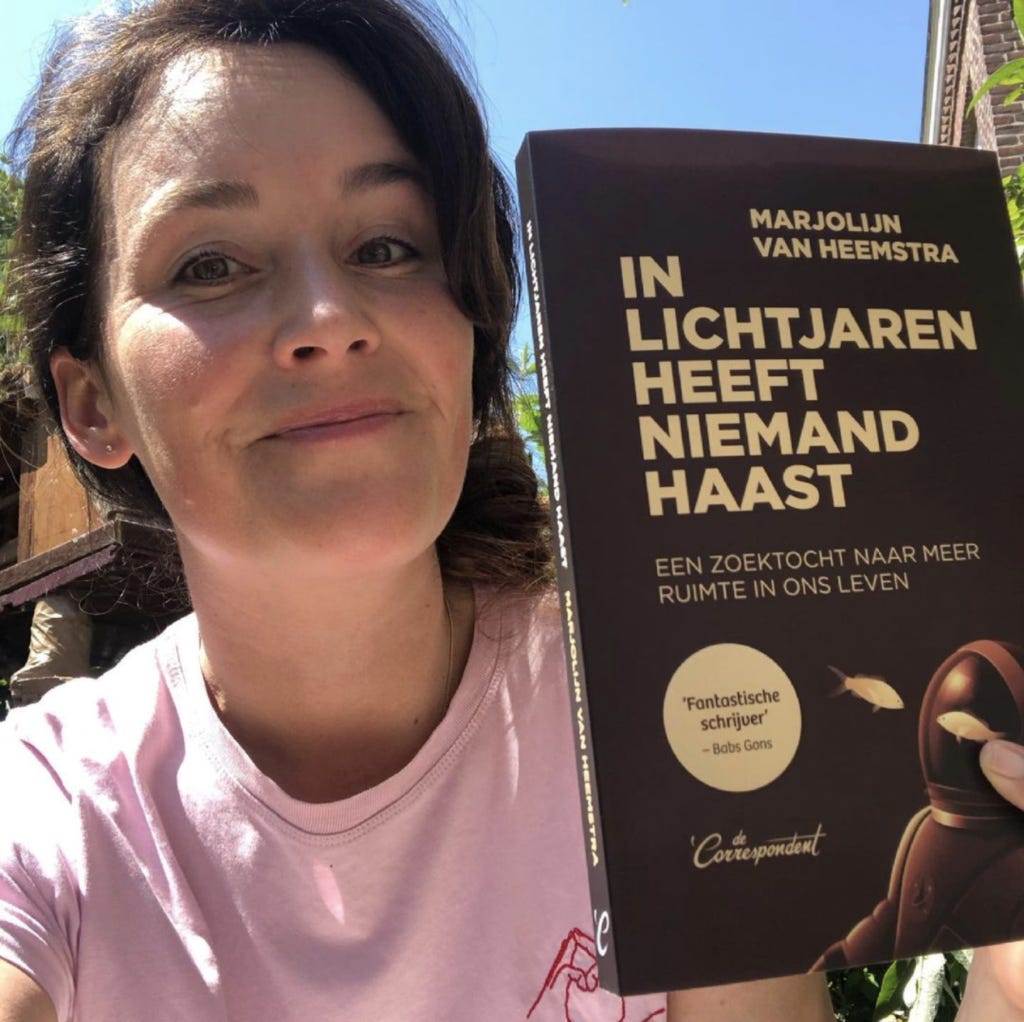 Ondertussen ondernam Marjolijn haar eigen ruimtereis. Bij haar leidde de Academie voor Stadsastronauten tot onder andere het theaterstuk Stadsastronaut (weer te zien), een correspondentschap ruimtevaart bij De Correspondent, en nu dus het boek In lichtjaren heeft niemand haast. We zijn pas net begonnen met lezen, maar we zitten er al helemaal in. Het boek is een even noodzakelijk als poëtisch betoog voor vertraging, bewegingsvrijheid, ruimtelijkheid en tijdloosheid. En voor verbondenheid, want uiteindelijk moeten we het hier toch met elkaar doen, op deze eenzame rots in het grote niets. Het is een persoonlijke, intieme, maar totaal herkenbare zoektocht naar ruimte, en hoe de ruimte daarbuiten ons ruimte in onze levens kan geven. Ruimte in een bestaan met agenda’s, deadlines, hypes en geldstress. Ruimte in een wereld die zich continu aan je opdringt. In lichtjaren heeft niemand haast is niet alleen heel mooi, het is bevrijdend. Het is een pleidooi voor het lange nu.Nu al het belangrijkste boek van het jaar, zeggen wij, helemaal niet bevooroordeeld.