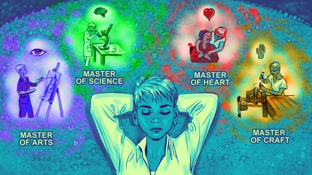 Ook emotionele intelligentie wordt nog steeds laag gewaardeerd. Denk aan verplegers, verpleegkundigen, mantelzorgers, politieagenten en basisschoolleraren – die trekken vaker dan niet aan het kortste eind qua sociale status en salaris. Vaak wordt niet eens erkend dat deze mensen unieke en onmisbare talenten hebben. Dat we zonder hen eigenlijk niet kunnen leven. De samenleving waardeert vooral cognitieve intelligentie, die een mens in staat stelt met abstracte concepten te werken. En creatieve intelligentie, die een mens in staat stelt buiten de gebaande paden te denken. Deze vormen van intelligentie hebben dan ook als enige een meestertitel; respectievelijk ‘master of science’ en ‘master of arts’. Ook zijn er allerlei andere titels, prijzen en eerbetuigingen te behalen in deze takken van sport. Maar je hebt niet zoiets als een ‘master of craft’ of een ‘master of hearts’. Laat staan andere titels, prijzen en eerbetuigingen. Maar waarom eigenlijk niet? Waarom kan je met manuele en emotionele intelligentie niet een levenslange leerweg doorlopen vol mijlpalen die erkend worden door de samenleving?