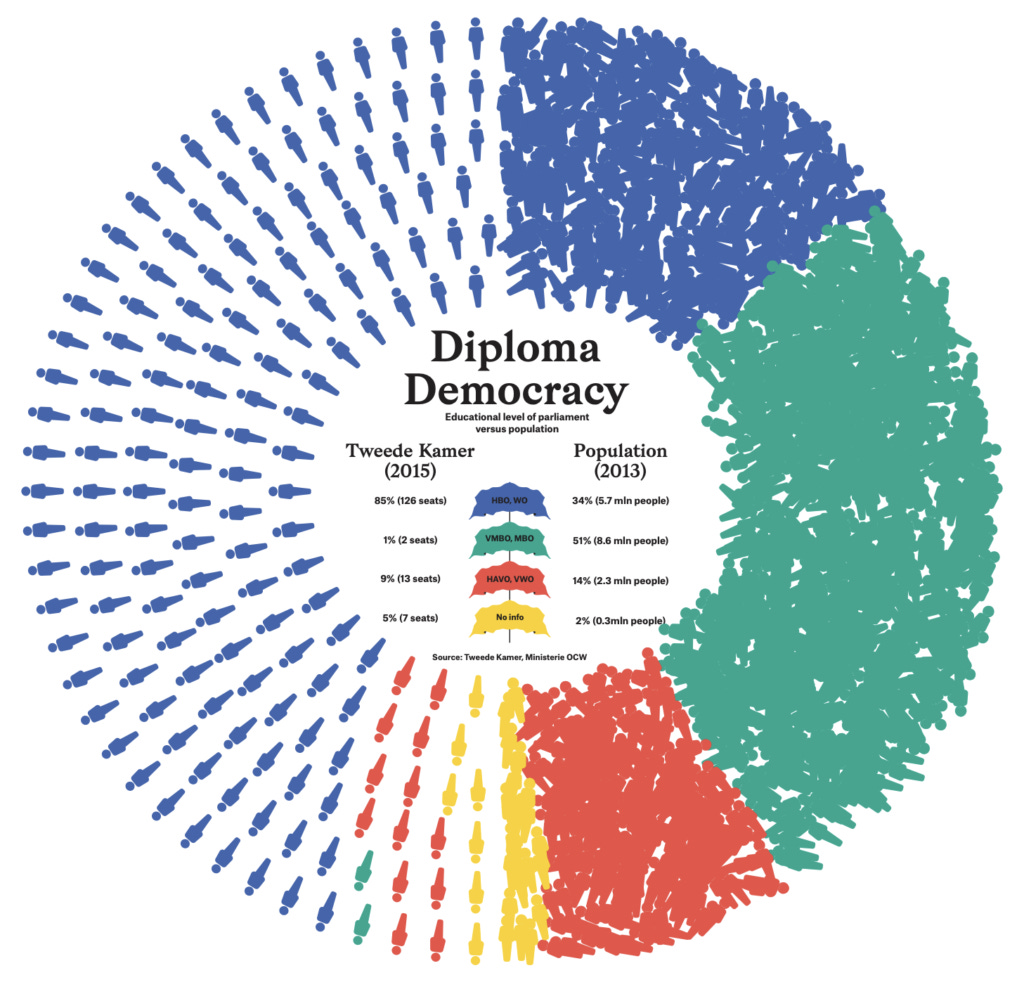 Ook wijst Visser terecht op de consequenties voor de democratie. ‘Hoogopgeleiden’ stemmen namelijk anders dan ‘laagopgeleiden’. Ook zijn er überhaupt bijna geen ‘laagopgeleiden’ te vinden in de landelijke politiek. In ieder geval niet in de volksvertegenwoordiging. Wat misschien wel verklaart waarom de politiek vaak zo’n empathisch zwart gat lijkt. Te weinig ‘laagopgeleiden’. Dit is op zich geen nieuw inzicht. Sinds Trump werd verkozen in 02016 is de non college educated white male opeens de belangrijkste demografische categorie in het Amerikaanse politieke landschap. In Nederland heeft het fenomeen zelfs een naam: de diplomademocratie. Mark Bovens en Anchrit Wille schreven er in 02010 dit artikel over op Sociale Vraagstukken en in 02014 dit boek.