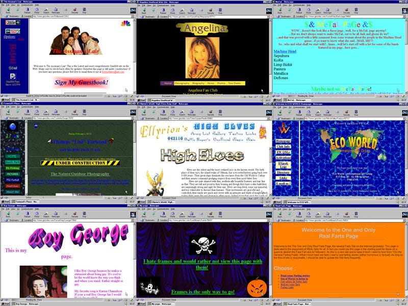 Het begon zo onschuldig. Hier een greep uit de zelfgemaakte websites op Geocities, een razend populaire webhosting service waar mensen in de jaren negentig gratis zelf hun websites op konden maken.