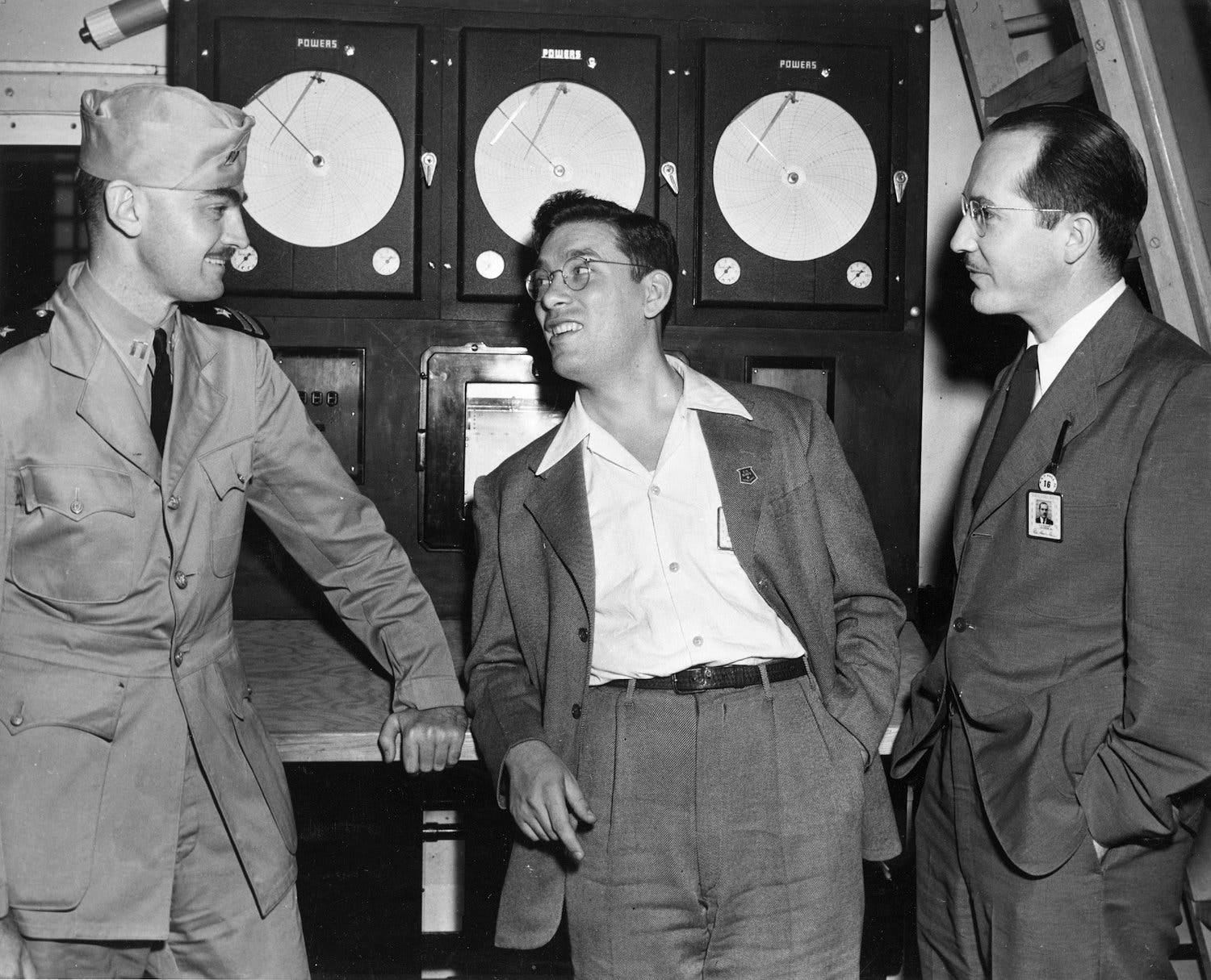 L. Sprague de Camp, Isaac Asimov en Robert Heinlein op de Philadelphia Navy Yard in 1944. Beeld: John Seltzer en Geo Rule.