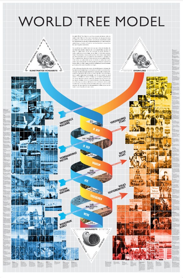 Maar je kan ook denken aan meer infographic-achtige visualisaties, zoals bijvoorbeeld de poster van het World Tree Model (ons historische-futuristische denkraam) dat Jasper van den Berg voor ons vormgaf.