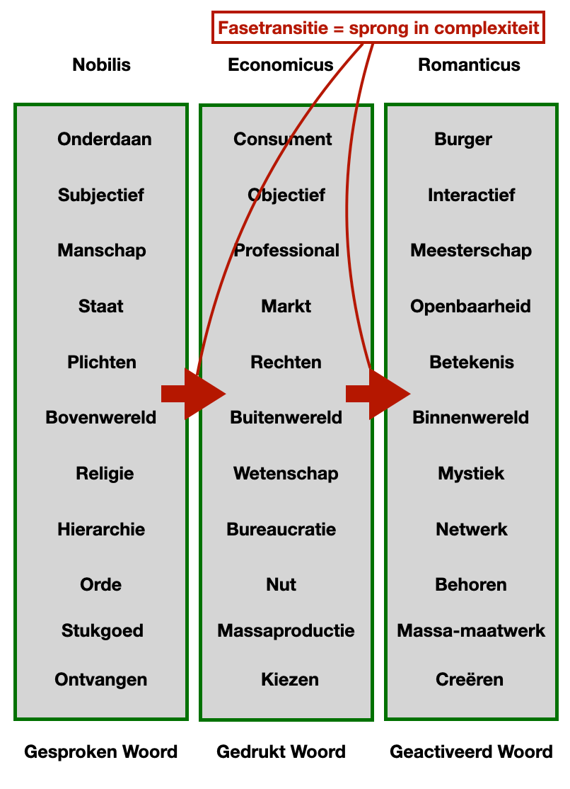 De overgang van de samenleving waarin de sociale en maatschappelijke instituties van de Homo Nobilis dominant waren naar een samenleving waarin die van de Homo Economicus dominant waren zou je een fasetransitie kunnen noemen. De transitie naar een ‘beschavingsfase’ die meer complexiteit kan dragen. De komst van de boekdrukkunst zorgde voor een hogere informatiedichtheid en het objectieve mens- en wereldbeeld zorgde voor een focus op wetenschappelijke waarheidsvinding en procesoptimalisatie.Â