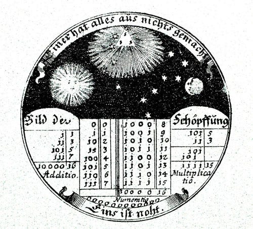 Simulatie is de essentie van het geactiveerde woord. Toen Gottfried Leibniz (01946-01721) binaire calculus uitvond (het rekenen met éénen en nullen, met aan en uit, de taal waar alle digitale computer op draaien) had hij een taal uitgevonden die alle andere talen kon zijn. Volgens Leibniz kan de binaire calculus alle talen, alle wiskunde en alle symbolen en betekenissen uitgedrukt worden in deze simpele universele taal. Hij geloofde zelfs dat heel God’s schepping geschreven was in deze taal, en dat we daarmee in digitaal universum leven. Een simulatie op een God’s computer. Ter ere van zijn inzicht liet Leibniz de bovenstaande zegel slaan.