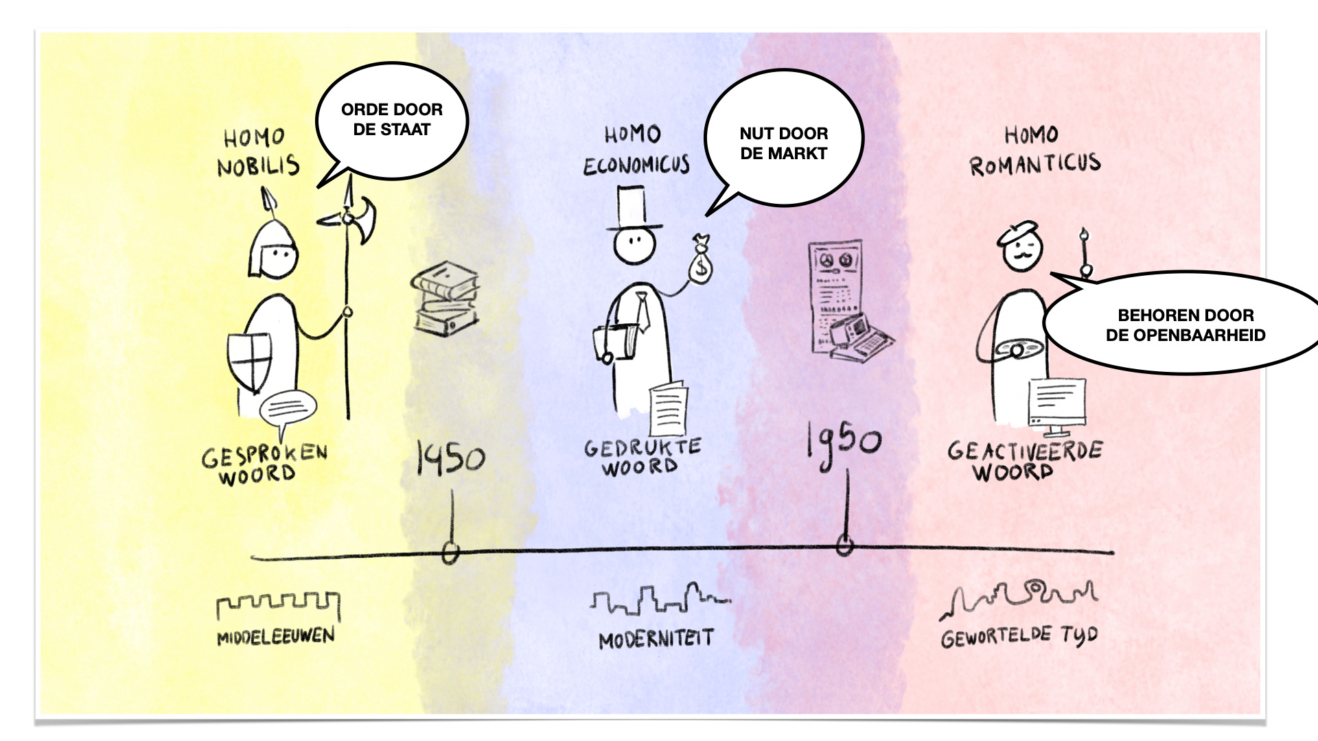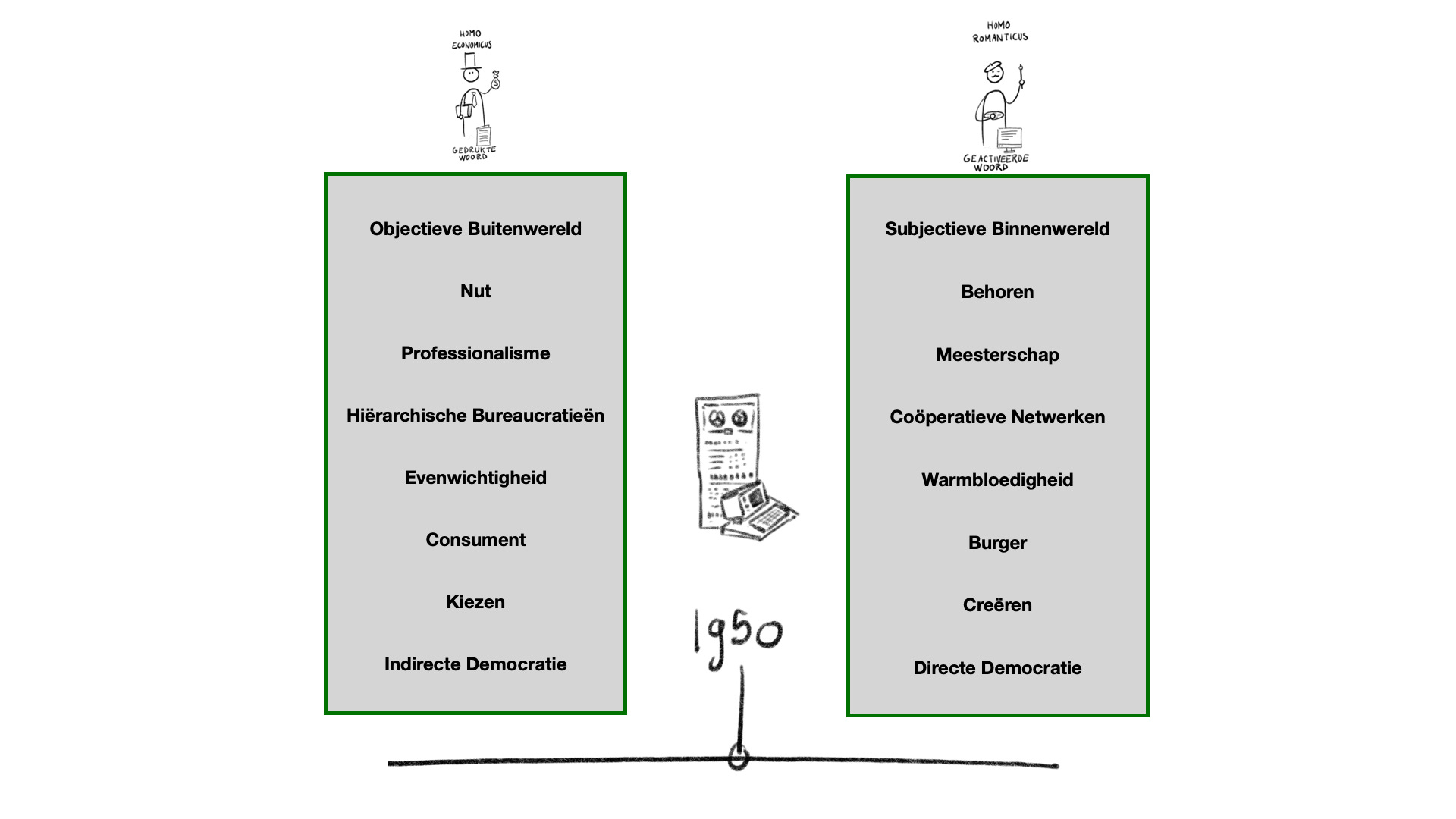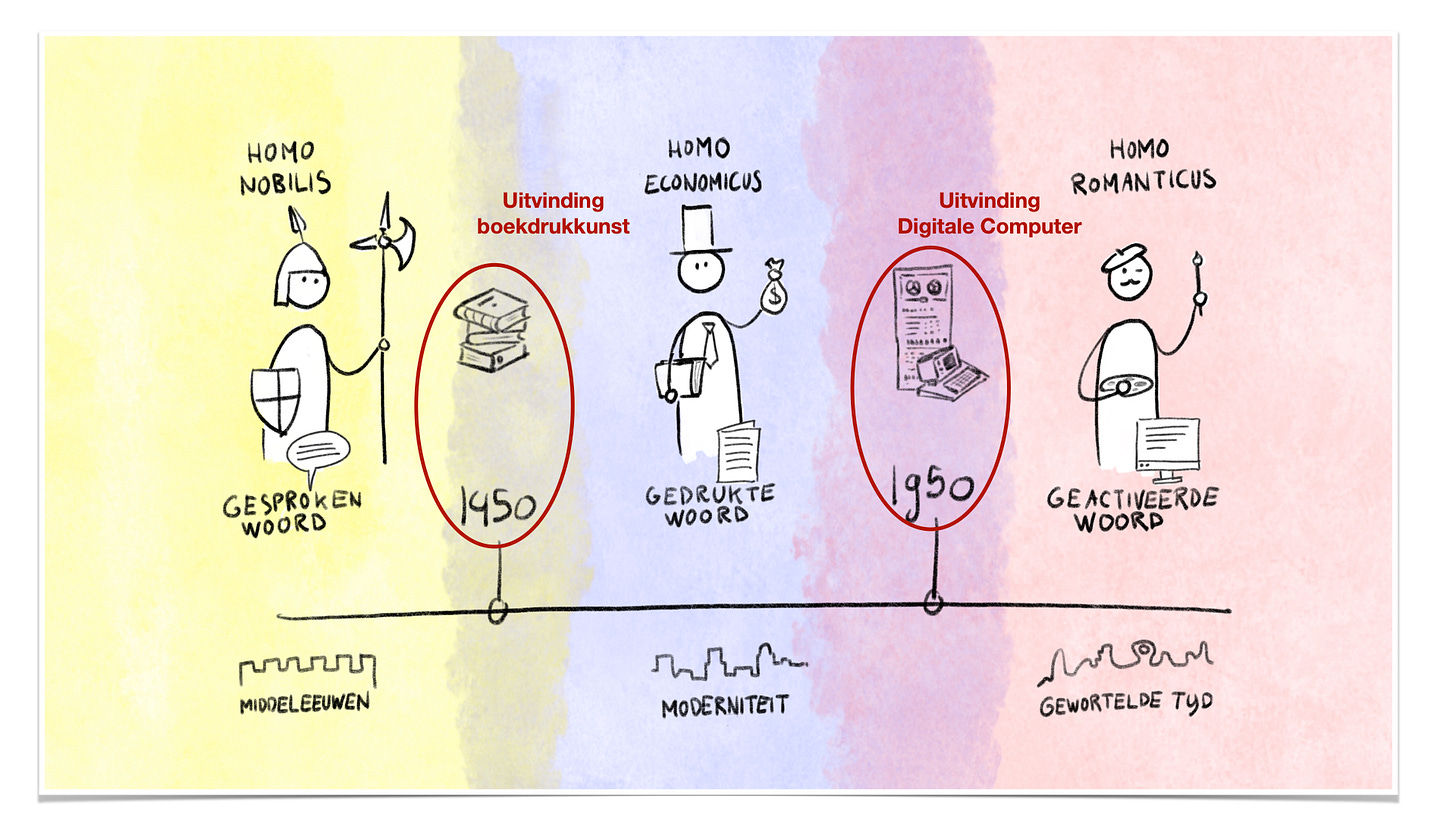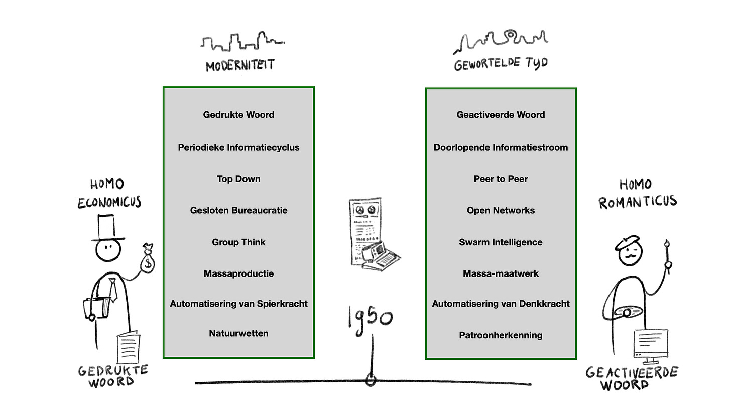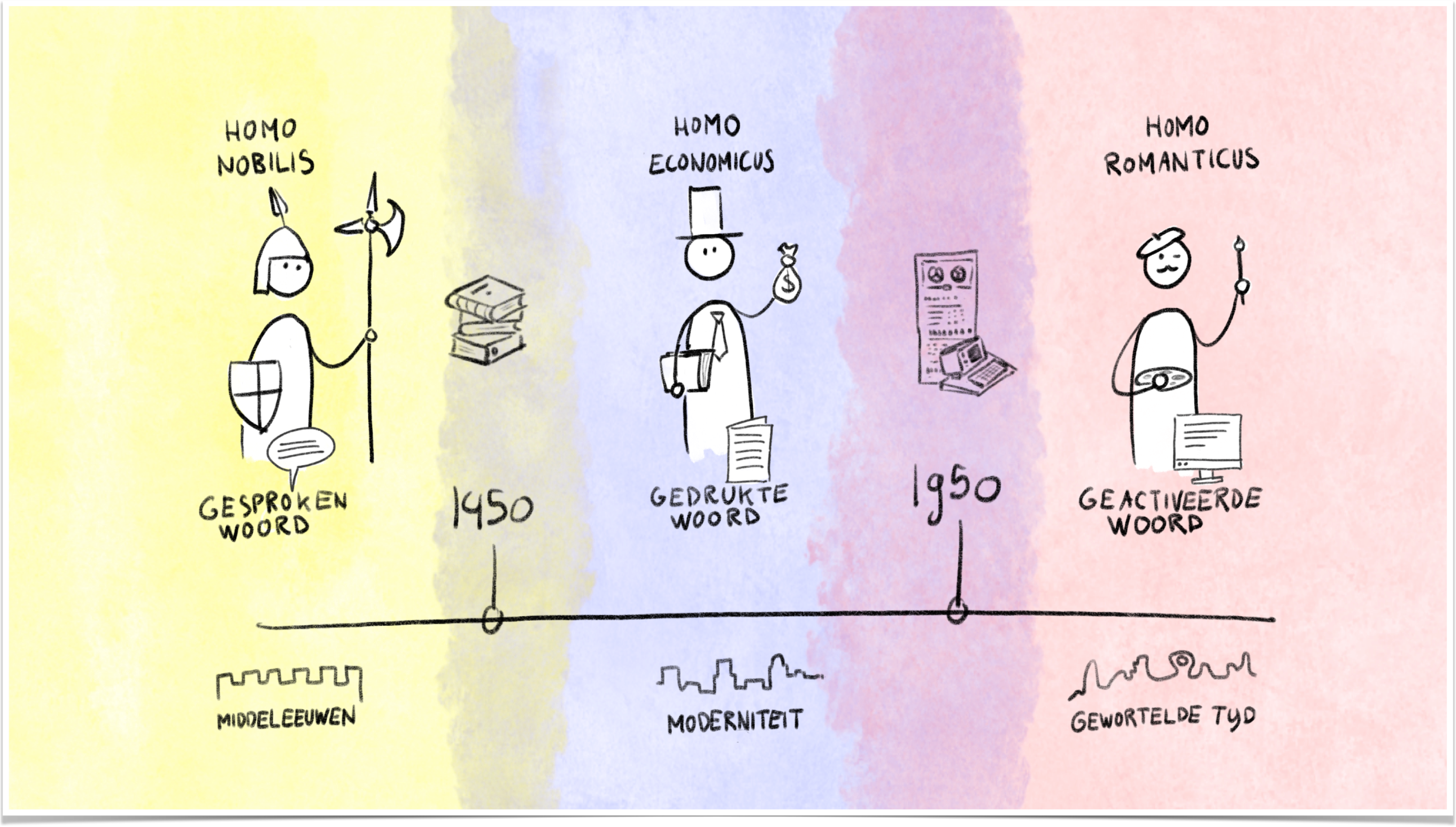 Wij zijn vandaag de dag getuige van de verschuiving van een samenleving die is gestructureerd door het gedrukte woord en door het objectieve mens- en wereldbeeld van de Homo Economicus, naar een samenleving die zal worden gestructureerd door het geactiveerde woord en het subjectieve mens- en wereldbeeld van de Homo Romanticus.