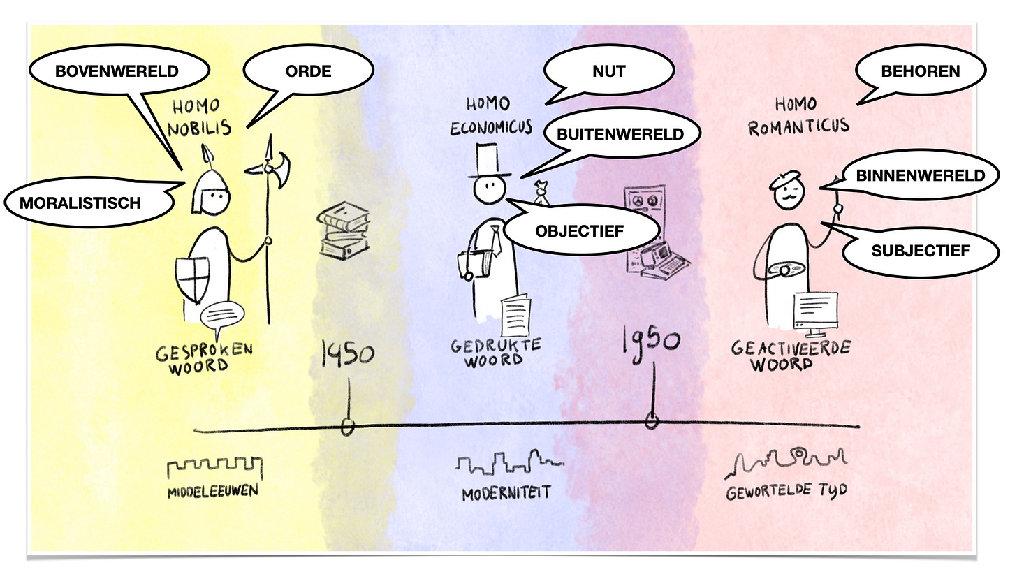 Onze mens- en wereldbeelden worden gesymboliseerd door drie archetypen. In de Middeleeuwen was het mens- en wereldbeeld van de Homo Nobilis dominant, tijdens de Moderniteit was het mens- en wereldbeeld van de Homo Economicus dominant en we zien nu het mens- en wereldbeeld van de Homo Romanticus opkomen.