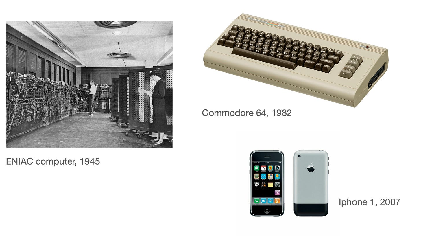 Na de Tweede Wereldoorlog ging het hard. Bestonden computers in 01950 nog uit enorme mainframes, machines die groter waren dan drie aaneengesloten klaslokalen – dertig jaar later stonden er personal computers op de meeste bureaus. Kleine computers die vele malen zo krachtig waren als de enorme mainframes van weleer. En weer dertig jaar later had iedereen een computer in zijn zak die opnieuw vele duizenden keren zo krachtig was als de computers in de jaren tachtig.