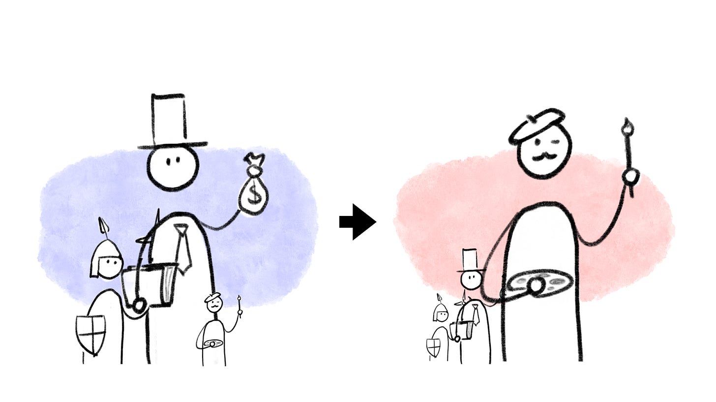 Maar denk ook aan de verschuiving van het feodale patronagesysteem in de Middeleeuwen, naar de professionele bureaucratie in de Moderniteit, naar wellicht kunstmatig intelligente netwerken waarin individueel meesterschap centraal staat.