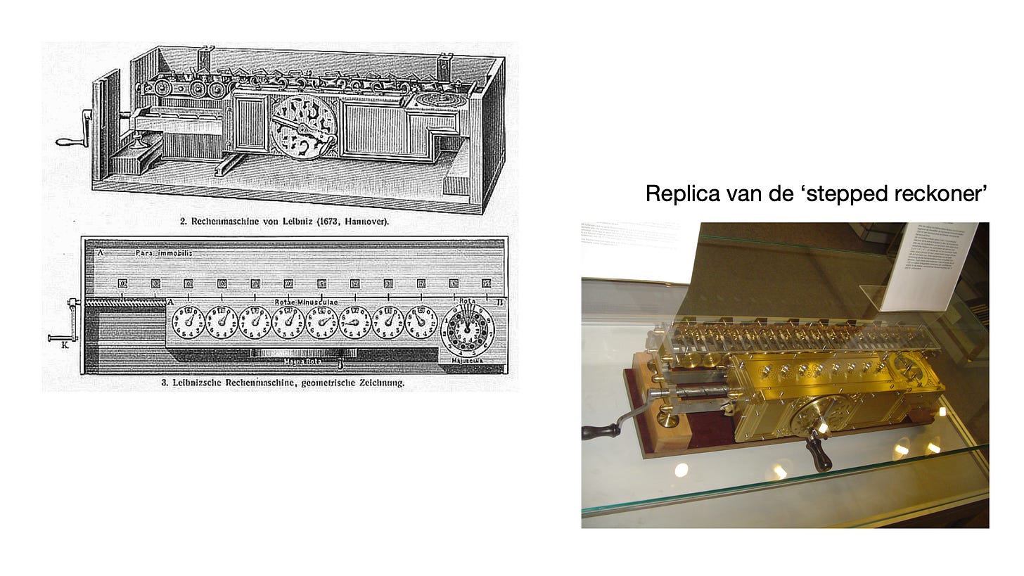 Op basis van deze theoretische ontdekking presenteerde Leibniz in 01694 ook de eerste binaire rekenmachine. Dit was een mechanische computer die automatisch kon optellen, aftrekken, delen en vermenigvuldigen. Een machine die tegenwoordig bekend staat als de ‘stepped reckoner’.