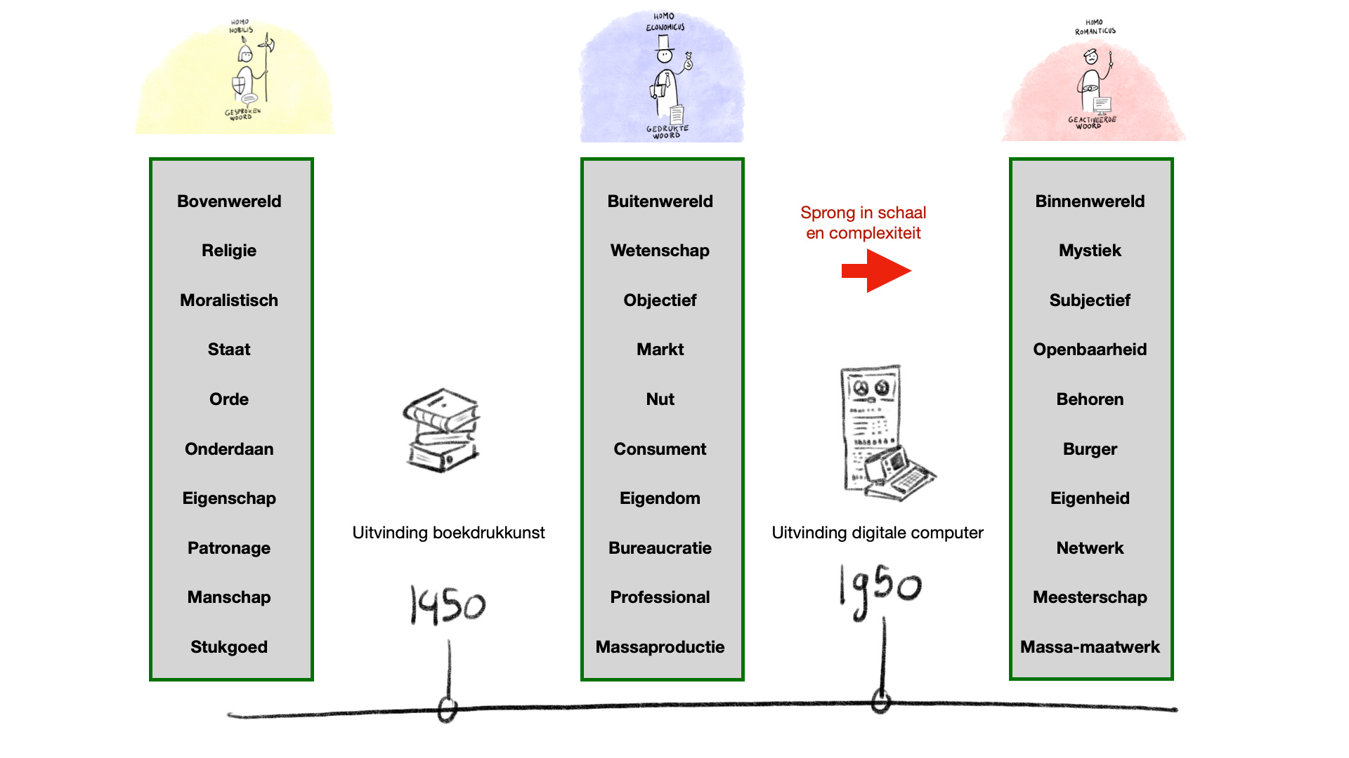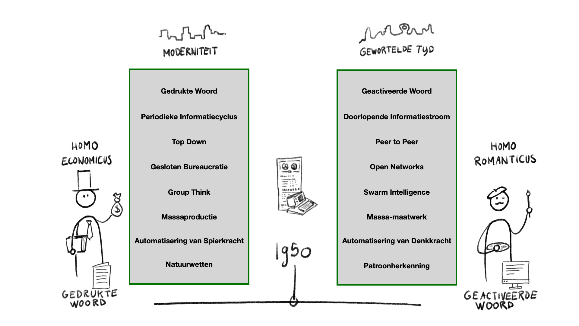De transitie naar een nieuw historisch tijdperk gaat dus gepaard met een fundamentele verandering. Een verandering in de manier waarop we onszelf en onze wereld ervaren, een verandering in hoe we kennis en informatie ordenen en, daaruit voortkomend, duizenden grote en kleine veranderingen in de vele manieren waarop we onze samenleving en ons werk structureren en van betekenis voorzien.