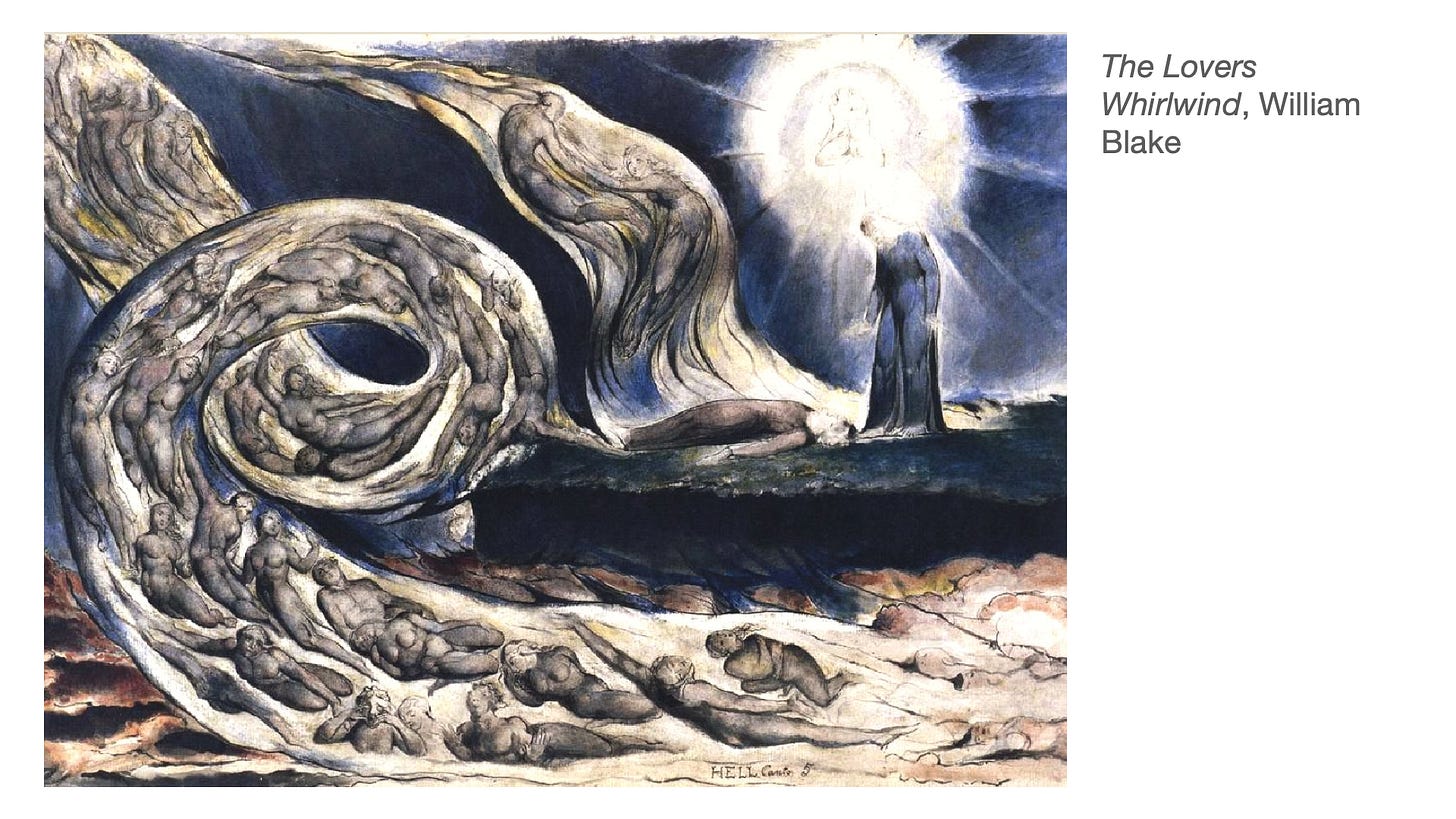Ongeveer tegelijkertijd, in Londen, verzette ook de dichter en schilder William Blake zich tegen de Moderniteit. Met lede ogen zag hij zijn geliefde Londen veranderen in een stinkend industrieel landschap. Ook Blake verfoeide deze rationalisering en utalisering van de buitenwereld. In zijn artistieke werk verkende hij daarom vooral de mythische en mystieke binnenwereld, als tegenhanger.