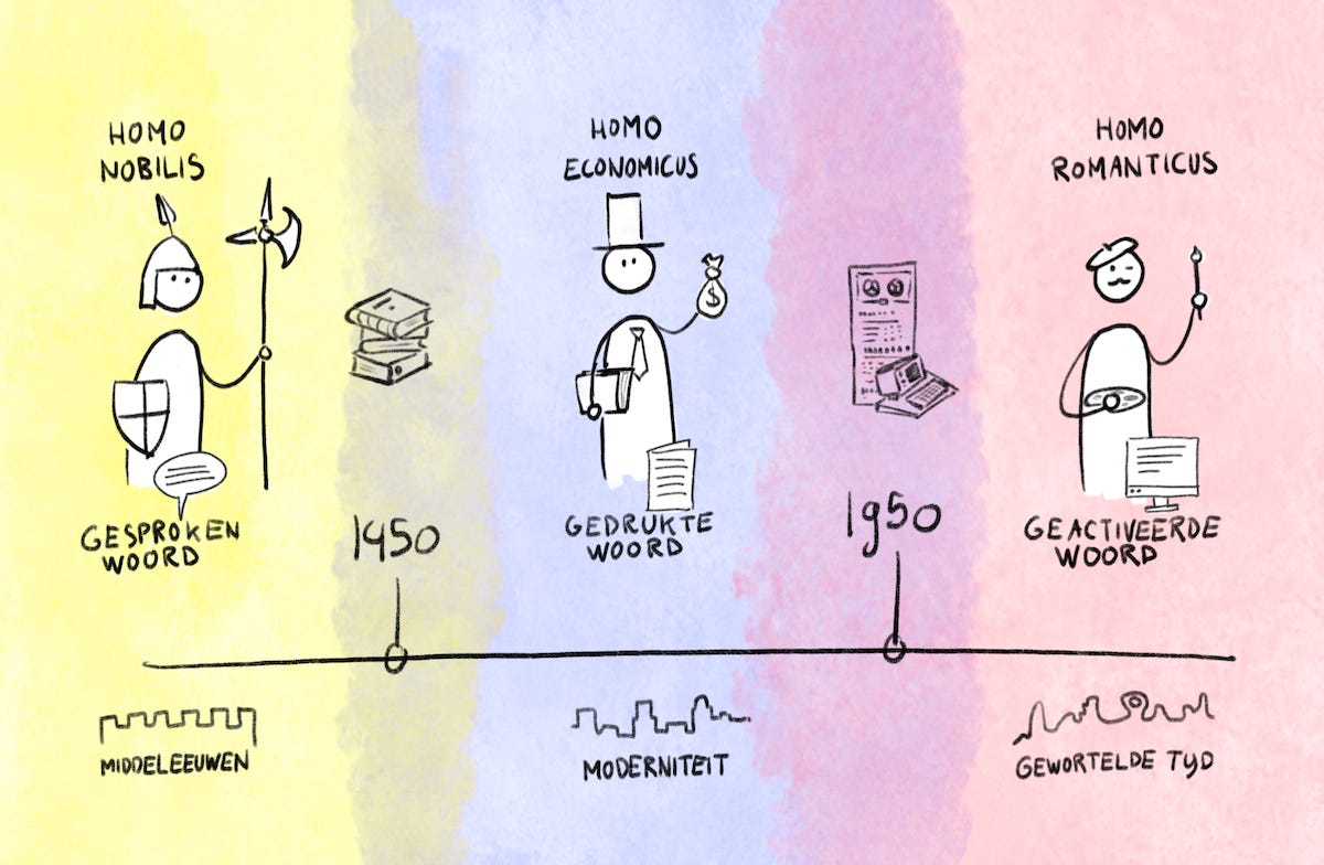 In de tijd van de Homo Nobilis was het geschreven woord overwegend liturgisch, vooral priesters beheersten het. Het was bijna iets heiligs en het werd vereerd. In de tijd van de Homo Economicus werd het geschreven woord een alledaags gereedschap en verloor het zijn heiligheid. Men was zich bewust van de beperkingen. Zo ging het ook met data. In het tijdperk van de Homo Economicus is data de heilige graal, wordt data gefetisheerd. In de tijd van de Homo Romanticus zal men zich bewust worden van de beperkingen ervan. Het zal slechts een handige toolkit zijn, toegankelijk voor Jan en alleman.