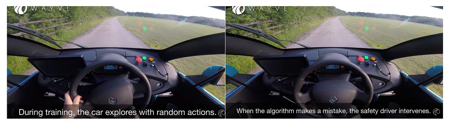 Bovenstaande frames vertellen kort de logica achter reinforcement learning. Zie hier het hele filmpje. In het filmpje zie je hoe een in beginsel totaal ongetrainde en onwetende Wayve AV binnen 20 minuten leert dat het de bedoeling is dat je op de weg rijdt en niet naast de weg. Na honderdduizenden uren reinforced learning en ontelbare correcties wordt impliciet dus ook een moreel besluitvormingskader gecreëerd.