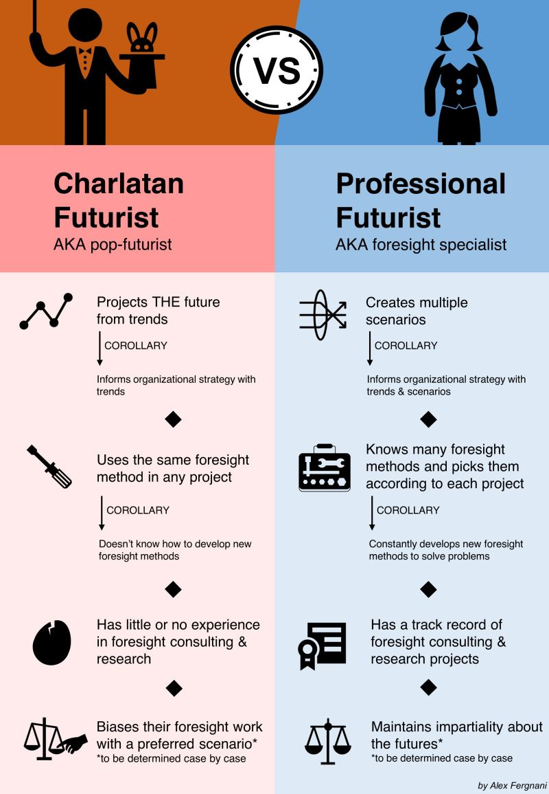 Het interessante hieraan is dat hij de professionele futurist als iemand neerzet die gespecialiseerd is in het ontwikkelen en uitvoeren van methodes en zich neutraal, objectief (en amoreel?) opstelt ten opzichte van de toekomstscenario’s die hij maakt. Het is duidelijk dat Fergnani zichzelf als professionele futurist identificeert en neerkijkt op de charlatan die veel normatiever is, gerichter op een eigen maakproces, en volgens hem dus vooroordelen heeft. Hoewel wij normatiever en met een eigen model en methode opereren pretenderen we echter nooit dé toekomst te voorspelen, en geven altijd aan vanuit welke aannames we een scenario maken. Maar goed, het futuristenveld is inderdaad divers en de titel is vogelvrij, dus dat iemand een poging doet zijn professie te claimen is begrijpelijk. Misschien moeten we een kolommetje toevoegen met de Craftsman Futurist, hoewel charlatan wel een fijn freak power randje heeft waar we ook niet ongevoelig voor zijn.