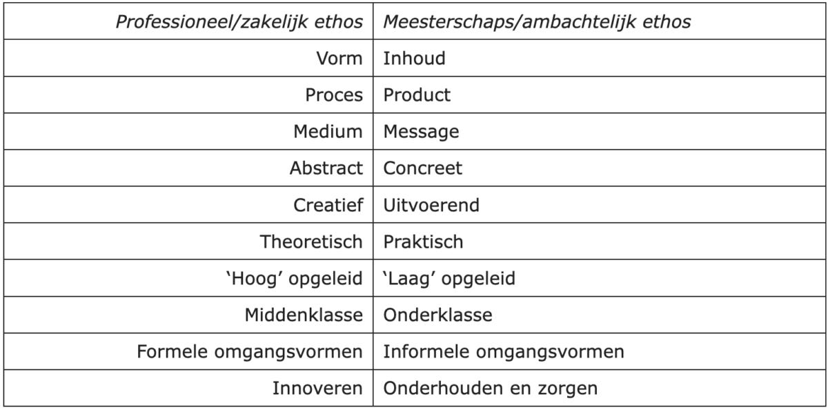 Het huidige werklandschap wordt gekenmerkt door een scheidslijn tussen professionele waarden en meesterschapswaarden. Het onderscheid tussen die twee is soms zacht en vloeibaar, en in andere gevallen harder en problematischer, zoals hoe genoten opleiding zich vertaalt naar kloven in de samenleving.