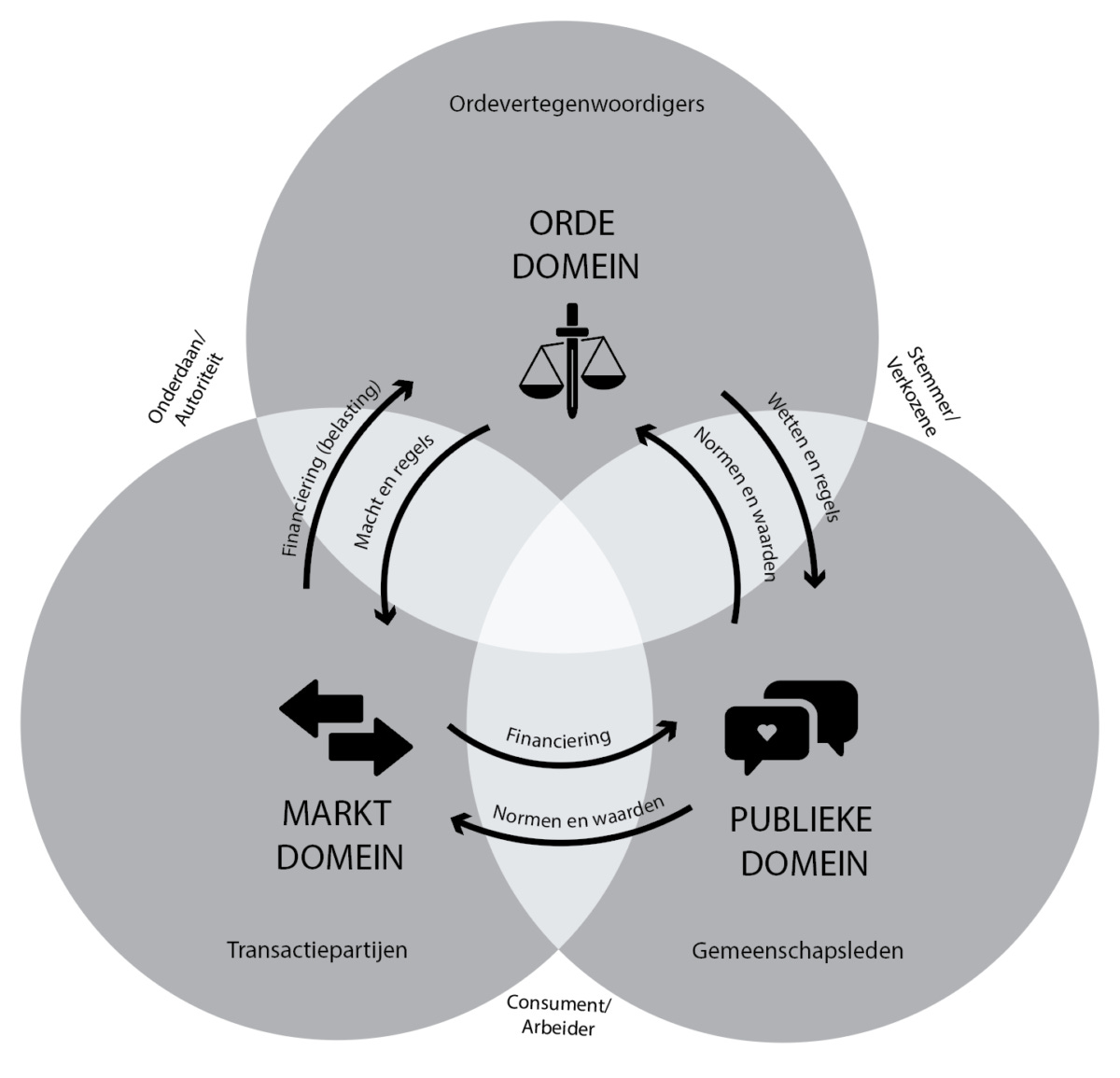 De drie cirkels vertegenwoordigen drie domeinen: (1) het orde domein; (2) het markt domein en; (3) het publieke domein.