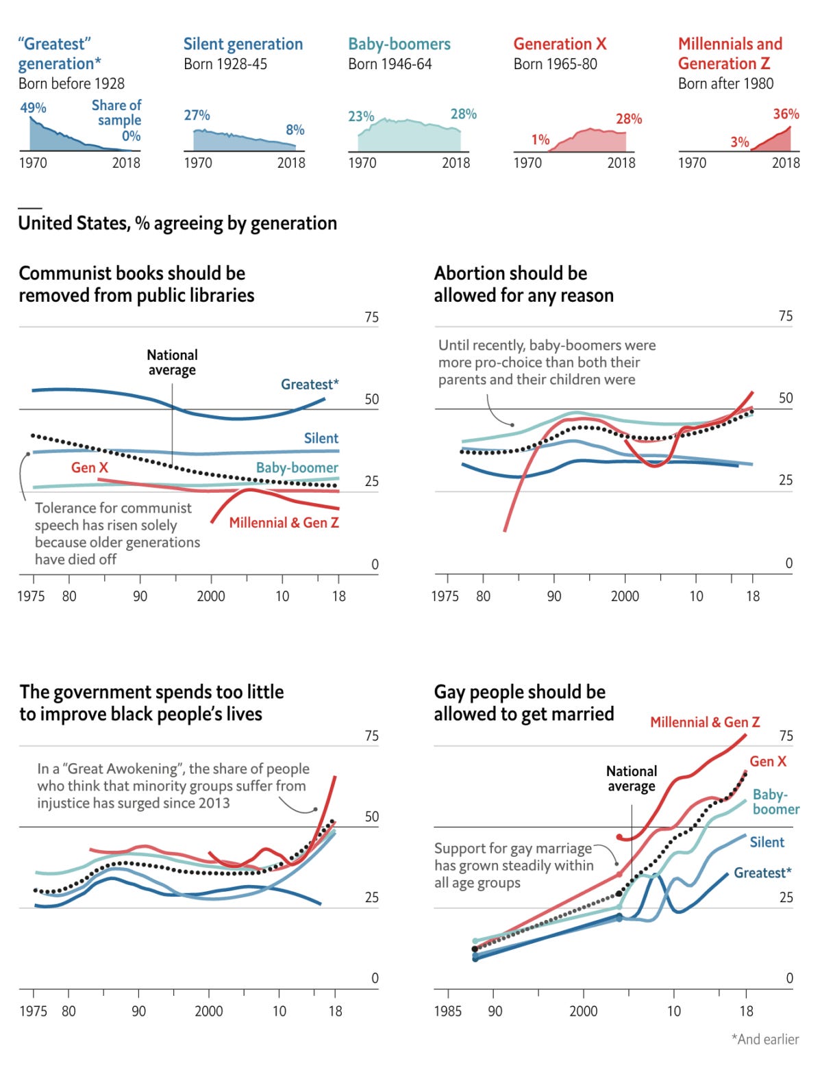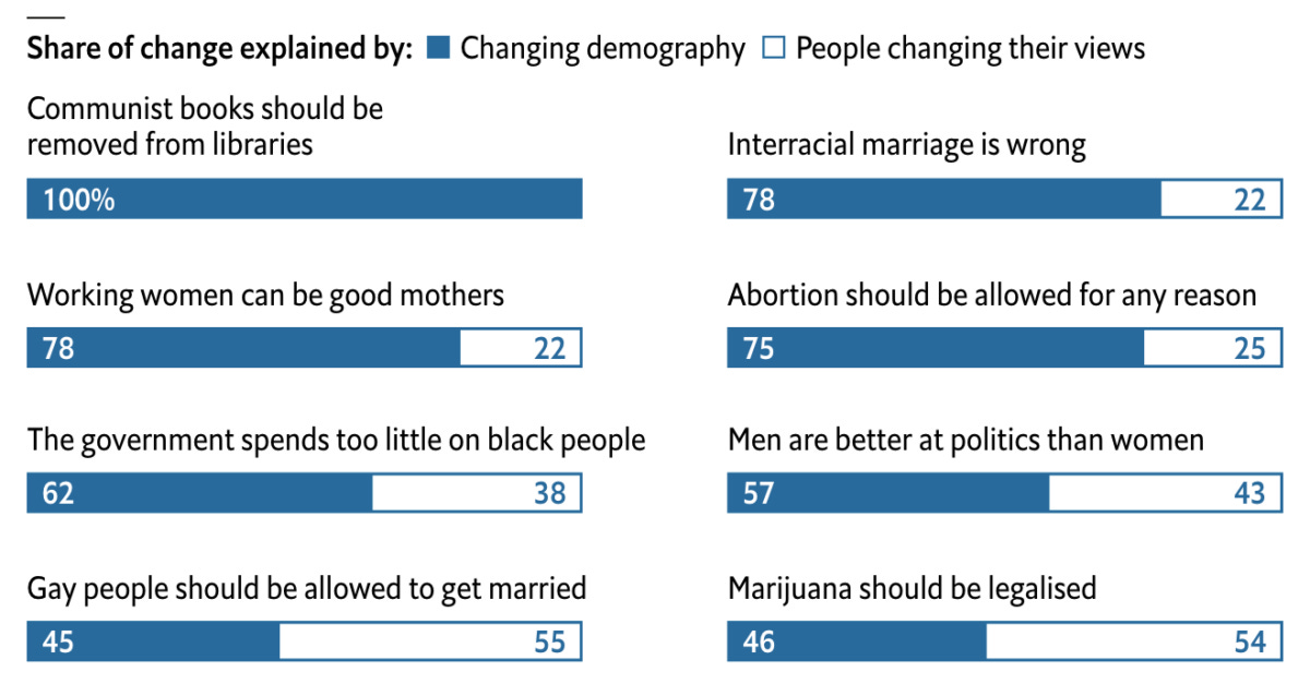 Talking About My Generation 🤘 Volgens dit artikel in The Economist veranderen samenlevingen sneller van mening dan individuen. Of, anders gezegd, culturen veranderen vooral omdat er generaties bijkomen en er generaties doodgaan. Niet omdat de mensen in een samenleving van mening veranderen. Deze dynamiek verschilt wel per thema. En, voor de activisten onder jullie: ‘In general, battles for hearts and minds are won by grinding attrition more often than by rapid conquest.’