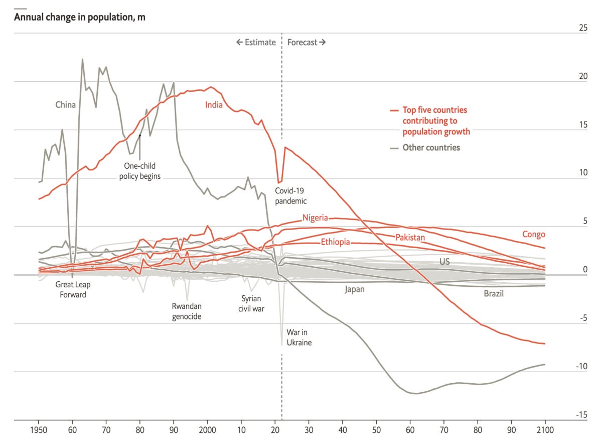 De Grote Demografische Krimp 📉 Een bijkomend onderliggend probleem voor China’s groeiambities is de krimpende bevolking. In onderstaande grafiek, gevonden op The Economist, zie je dat de Chinese bevolking nu al krimpt en, naar verwachting, steeds sneller gaat krimpen. En, gezien de onbetrouwbare statistiek uit China, is de kans groot dat de cijfers rooskleuriger zijn dan de werkelijkheid.