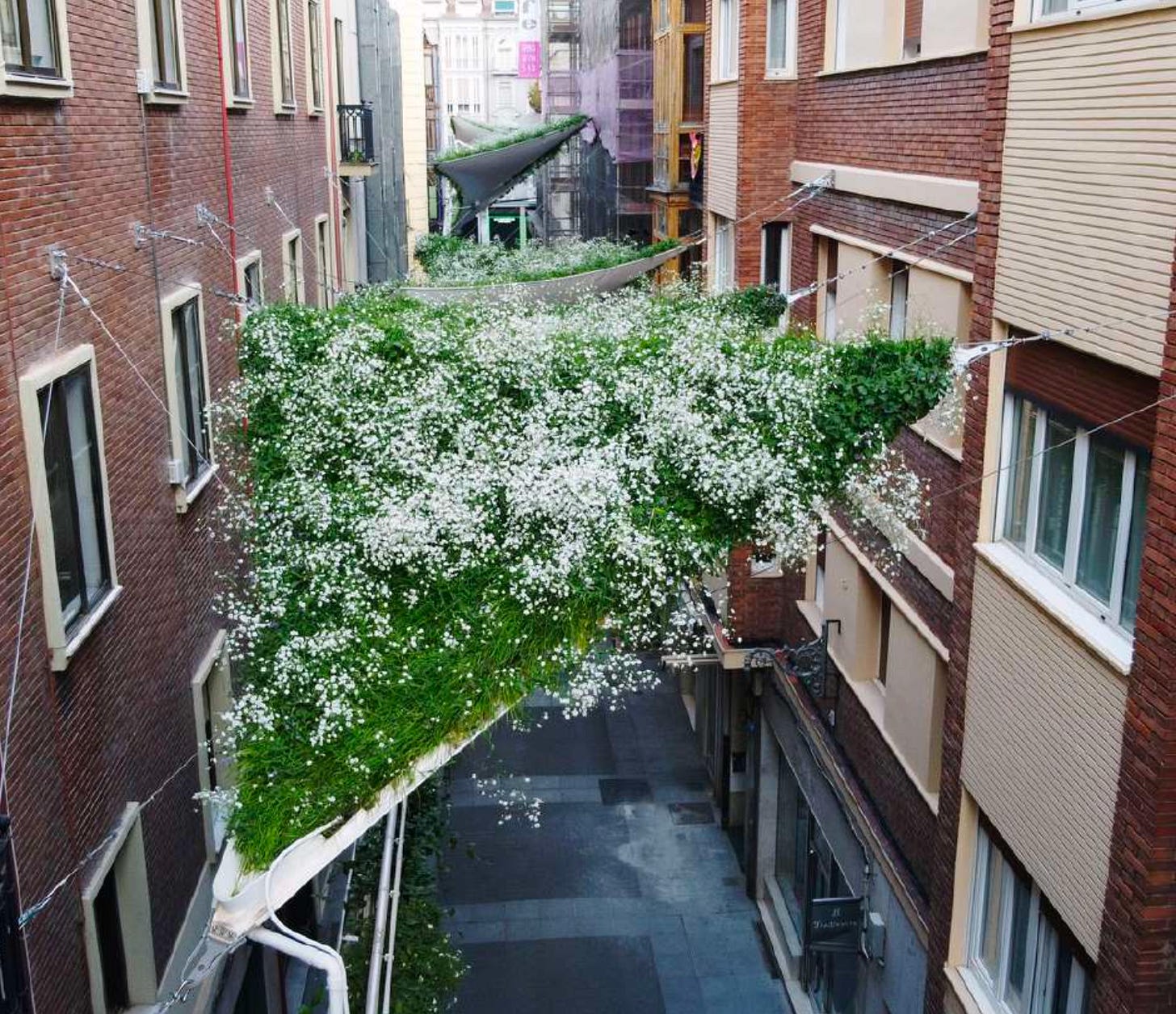 De onderstaande groeiluifels bieden een uitkomst voor verkoelende vegetatiestructuren in de krappe straten van het Spaanse Valladolid. Kijk voor meer informatie hier of bekijk dit filmpje. De aan de gevels opgespannen luifels hebben een ingezaaide hydroponische ondergrond, voorzien van een irrigatiesysteem en een waterafvoer. Voor meer informatie, zie de website van de makers, Singular Green.