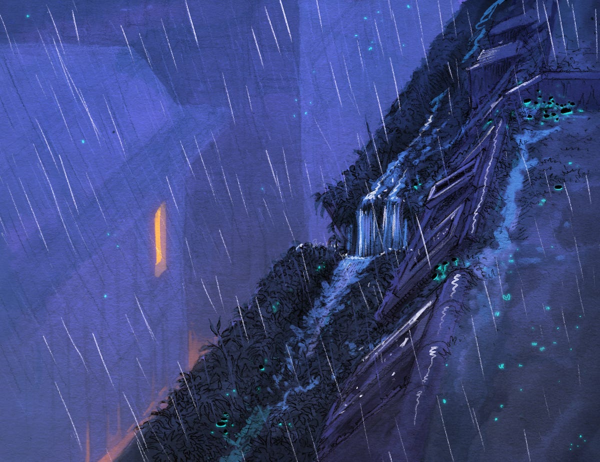 De daksloot komt uit onze eigen speculatieve koker en is samen met de gevelbeek en de vegetatietrap onderdeel van een set bouwelementen die voor de blauw-groene dooradering van de Poreuze Stad moeten zorgen. Althans zoals wij die voor ons zien in ons aanstaande boek. Wat betekent dat in de Poreuze Stad naast regen op je zolderraam er ook een kabbelend beekje met bioluminicenrende paddestoeltjes onder je raam loopt, en dat je in de vroege ochtend wellicht gewekt kunt worden door een kwakende kikker op je vensterbank. Samenleven met de natuur is magische, maar soms ook heel irritant.