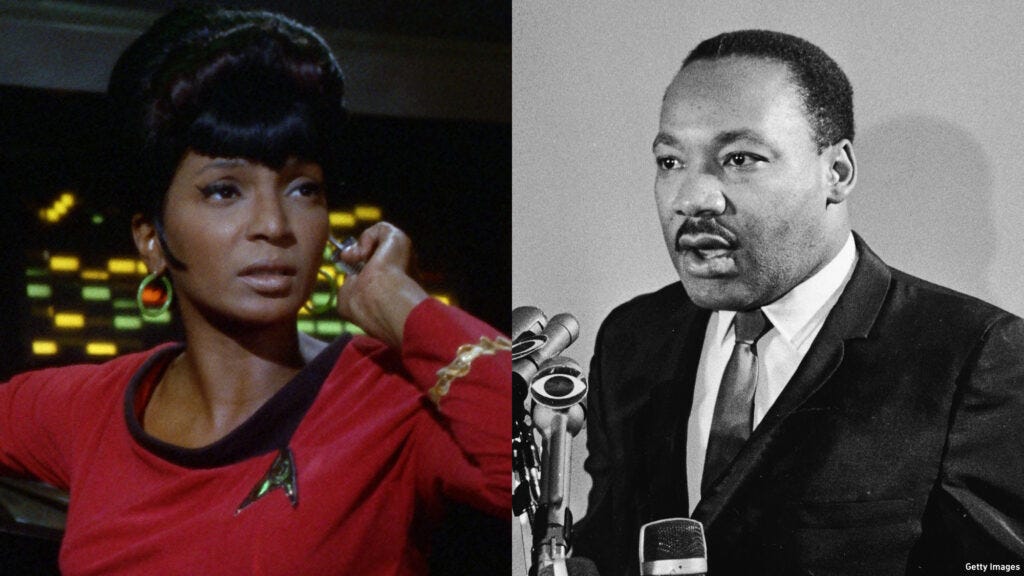 Niets illustreert dit beter dan het verhaal van Martin Luther King Jr. en Luitenant Uhura. MLK was een groot fan van Star Trek en met name van Nichelle Nichols. Nichols was een zwarte vrouw die een kick-ass brugofficier speelde op Kirks Starship USS Enterprise. Het verhaal gaat dat Nichols na het eerste seizoen aan Gene Roddenberry, de bedenker van Star Trek, zei dat ze wilde stoppen. Ze wilde haar dromen najagen op Broadway. Roddenberry schrok zich een hoedje en vroeg haar om er nog een weekendje goed over na te denken. Tijdens dat weekend had ze een fundraiser waar het personeel haar op een gegeven moment attendeerde dat haar grootste fan wanhopig was om haar te ontmoeten. Nichols stemde toe. De fan bleek Martin Luther King Jr. te zijn.